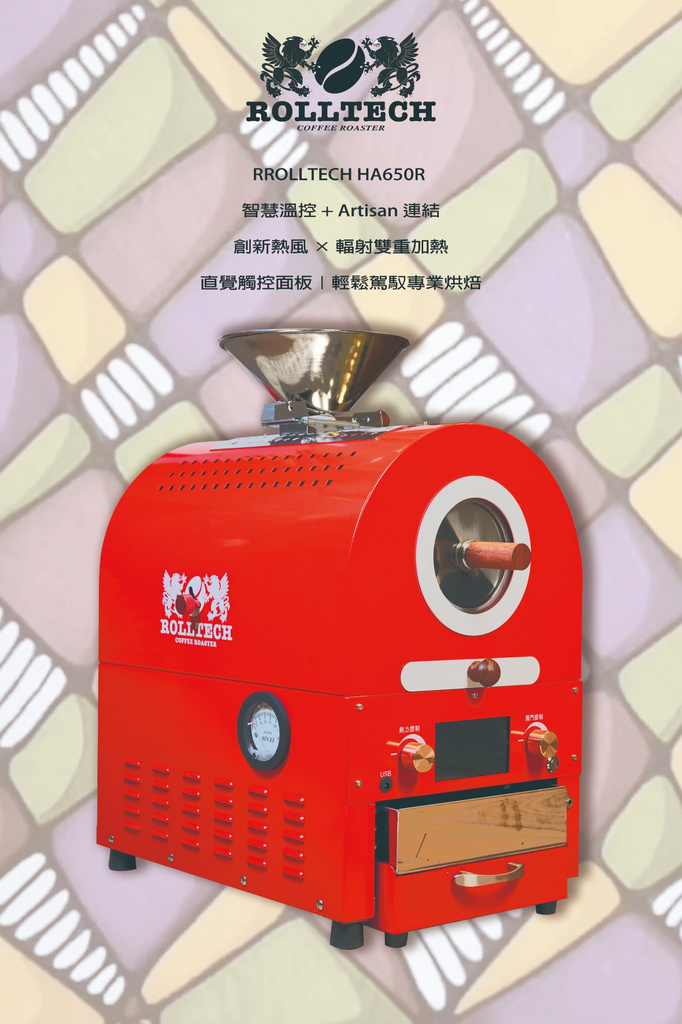 彤承企業 ROLLTECH HA650型烘豆機全新改款, 液晶觸控螢幕,可再外接Artisan烘焙曲線軟體,加熱管1700瓦,濾煙器效能1000瓦,環保高效能設計,穩定輸出,讓烘焙體驗無煙的環境,純淨無憂外,更能確保每一鍋烘焙都達到最佳狀態。